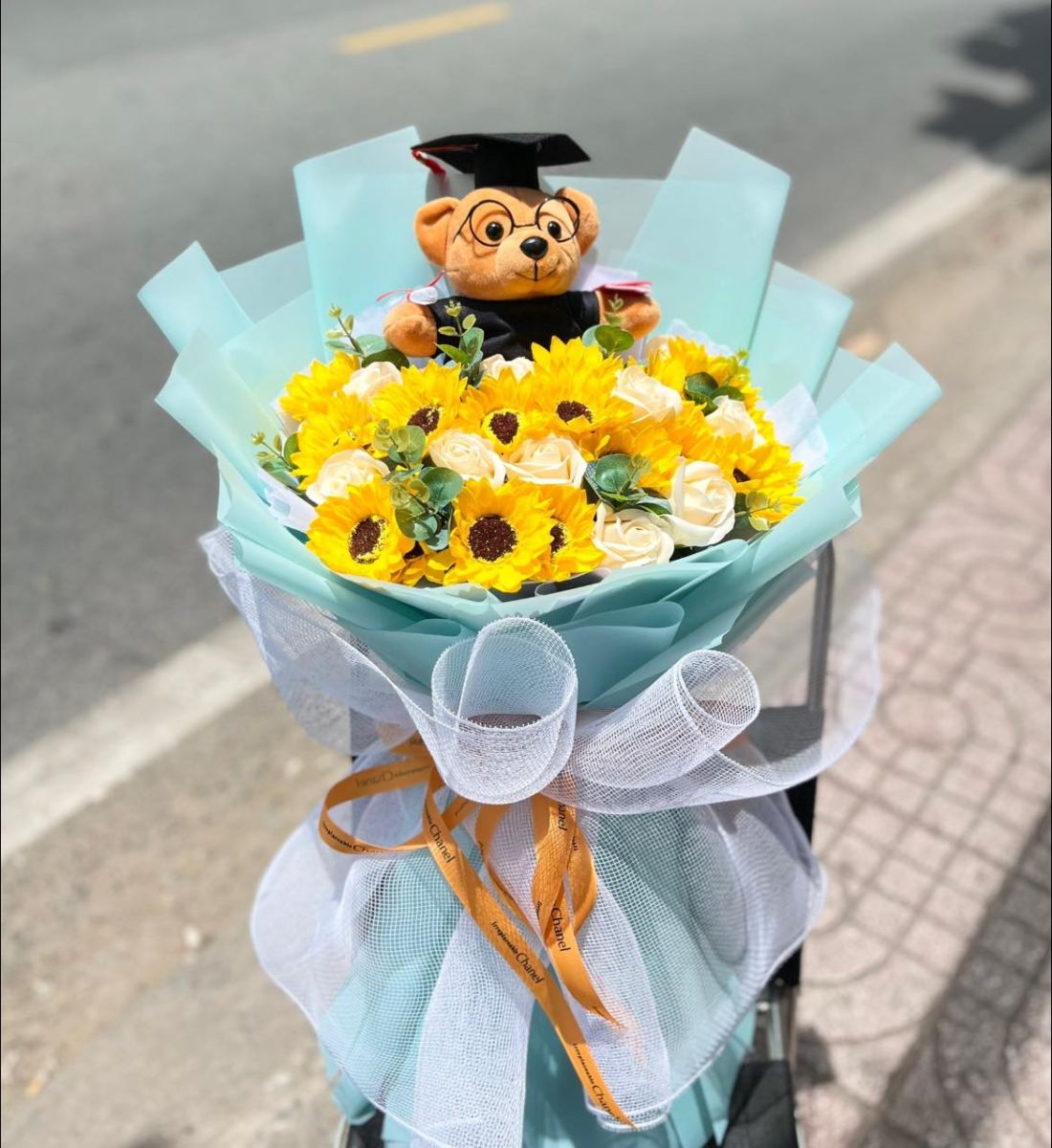 Thiết kế hiện đại, bắt kịp xu hướng: Hoa tốt nghiệp được trang trí thêm phụ kiện như nón tốt nghiệp, gấu bông mini, ruy băng, giấy gói cao cấp tạo nên sự trẻ trung, cá tính.